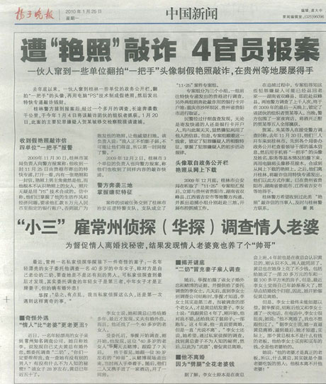 常州.分手公关策划名事务所:发起人-华先生(华探)2010年1月25日接受《扬子晚报》专栏采访报道与好评