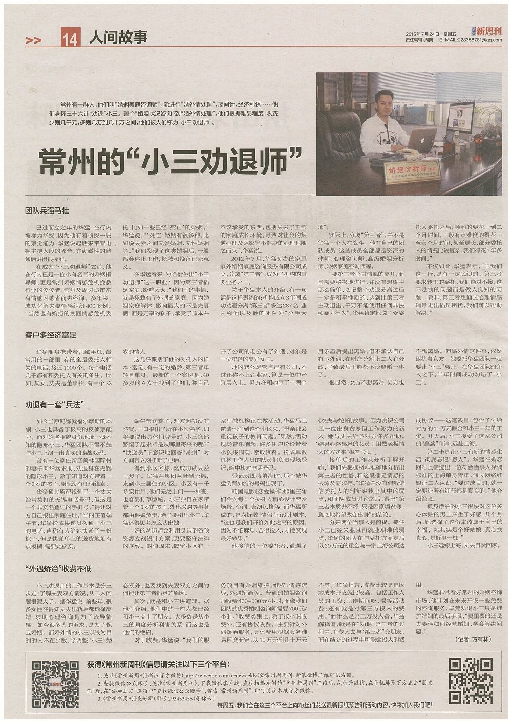 常州.分手公关策划名事务所:发起人-华先生(华探)2015年7月24日《新周刊》14版整版采访报道与好评