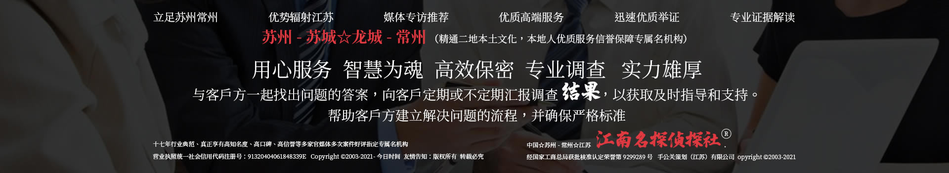 经工商总局核准注册司.法部门备案的调查研究中心·苏锡总部.常州公司欢迎您来实地考察洽谈,江南名探调查十七年从业经验多次接受江苏卫视.常州电视台.苏锡电视台.姑苏晚报.常州晚报.扬子晚报等多次成功案例访谈给予高口碑好评指定信誉调查侦探服务公司.