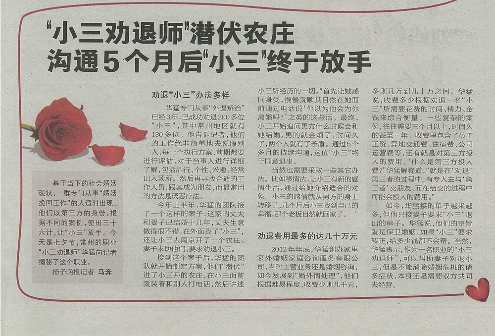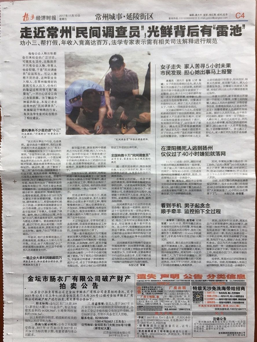 常州.分手公关策划名事务所:发起人-华先生(华探)2017年11月10日接受《扬子晚报》C4版专栏采访报道与好评
