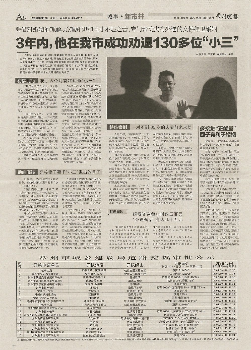 常州.分手公关策划名事务所:发起人-华先生(华探)2015年8月12日A6整版《常州晚报》专栏采访报道与好评