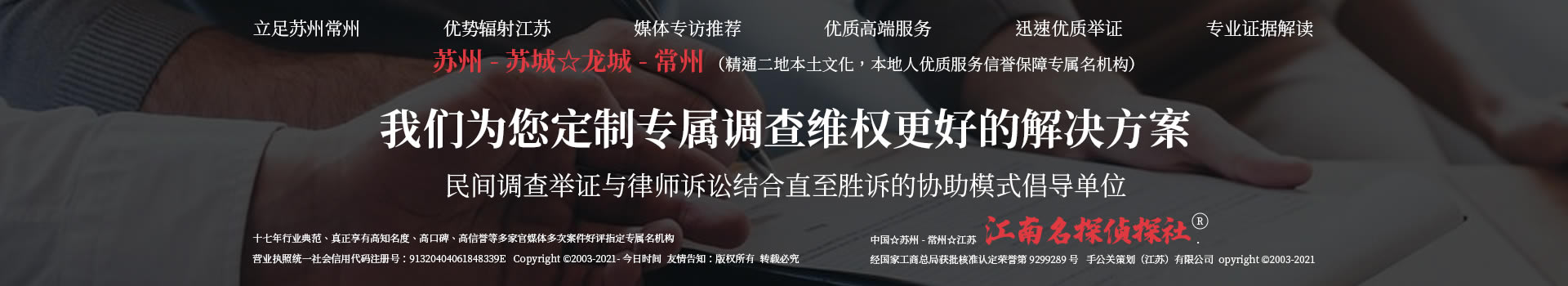 专注法律调查多年,用证据说话,靠细节取胜、以专业立命。在繁纷复杂的商业各领域,真正做到了强敌千万变,中国.常州-苏锡.江苏江南名探调查名机构犹可为!